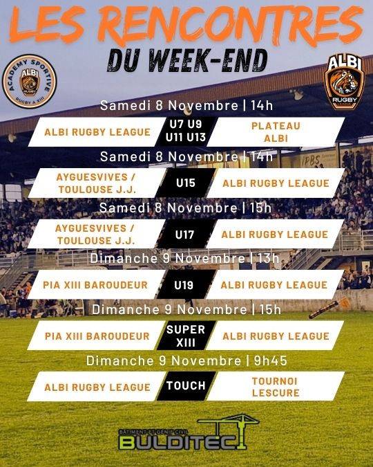 Academy (U13): Rencontre amicale contre Réalmont en vue de la 1/2 finale de Coupe de la Ligue à 13 le 15 novembre, contre Académie Geckos Catalans, 13 Catalan, Saint Estève ou Limoux.