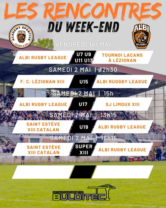 Super XIII: Pas de rencontre cette semaine, l'occasion là aussi de faire souffler les organismes pour préparer la fin de saison et de réintégrer les joueurs pour une fin de saison qui ne laissera plus aucun week-end de repos, avec un déplacement à Saint Estève XIII Catalan la semaine prochaine et la réception de Lézignan le dimanche 10 mai à Mazicou à 16h (u19 à 14h).